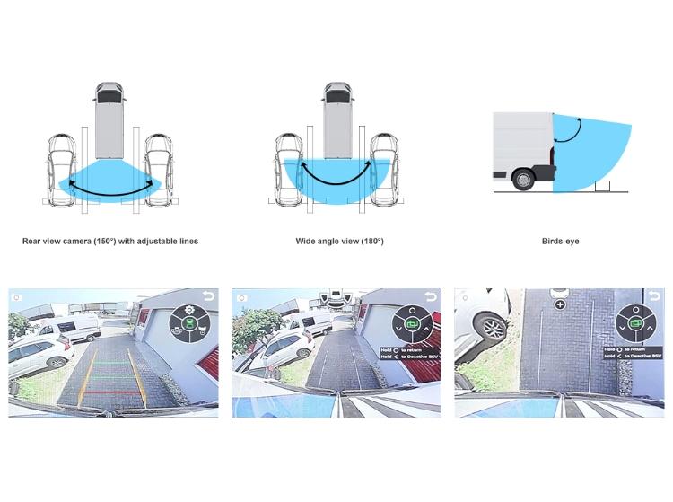 Reversing camera with switchable angle views: rear view camera (150°) with adjustable lines; wide angle view (180°); viewing from above for visual control when connecting a trailer (zoom); rear view mirror function (150°) for permanent display.