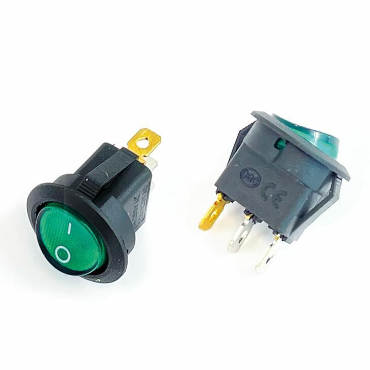 Grønn av/på-bryter med lys. 12V, 16A, rund